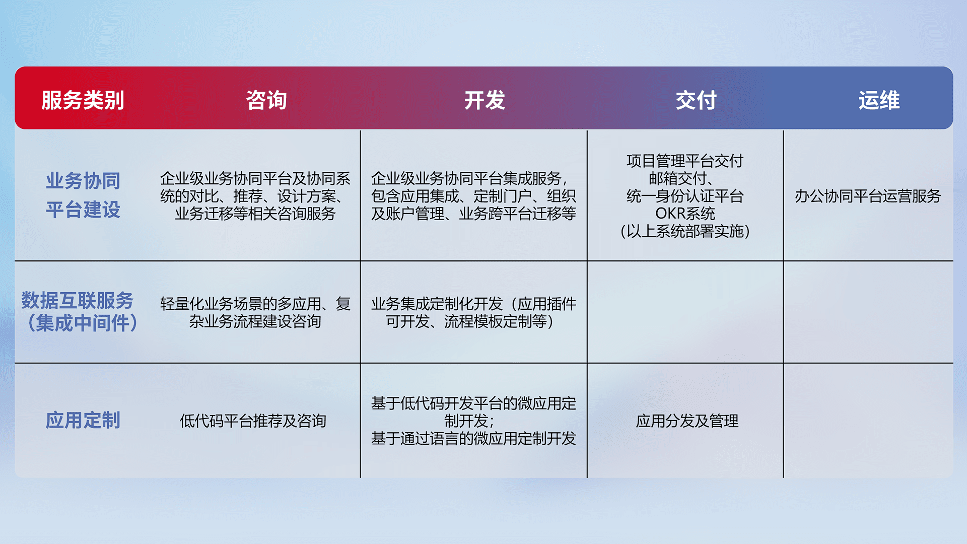 针对钉钉、、、企微、、、IDaas等平台级产品提供产品的规划、、方案、、交付、、、、定制化开发等服务,,实现如统一协同办公、、、、智能客户服务、、、混合会议管理、、、智能数据查询、、、等业务场景,,,实现数字化转型。。。。